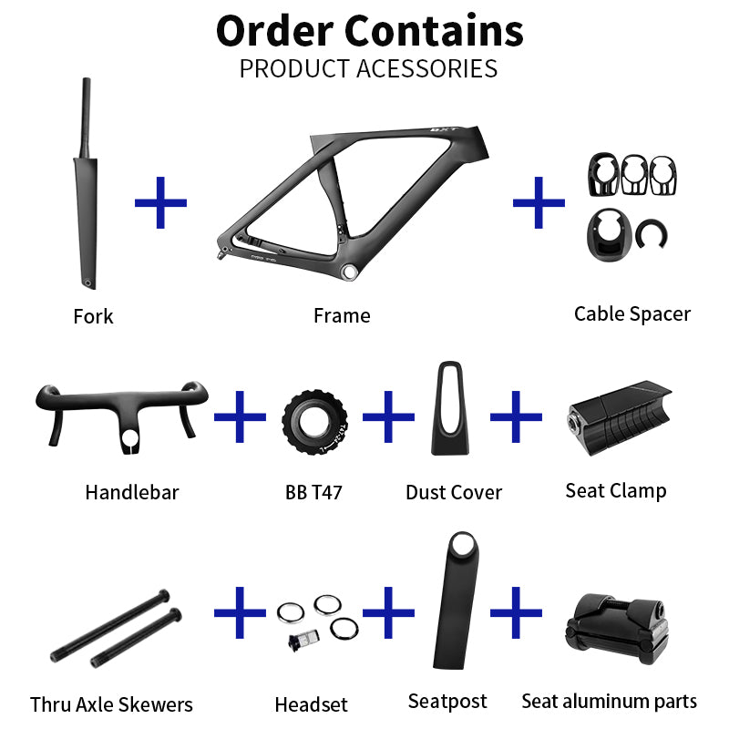 Order Contains Frame+Fork+Handlebar+Seat Post+Seat Clamp+Thru Axle Skewers+Headset