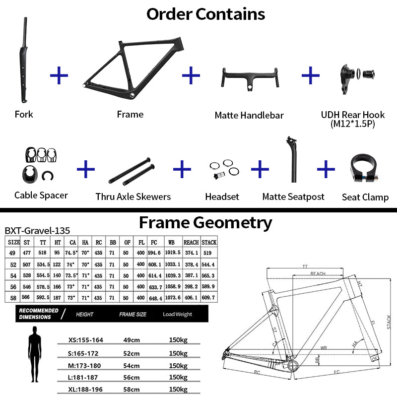 | Order Contains | Frame+Fork+Handleba+Seat Clamp+Thru Axle Skewers+Headset | Max Load | 150kg |
